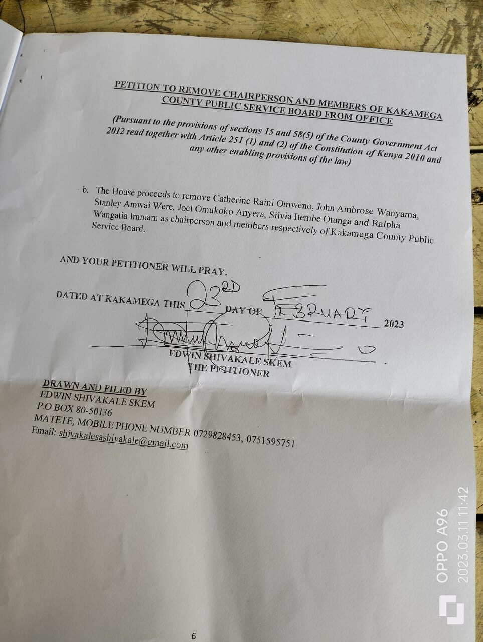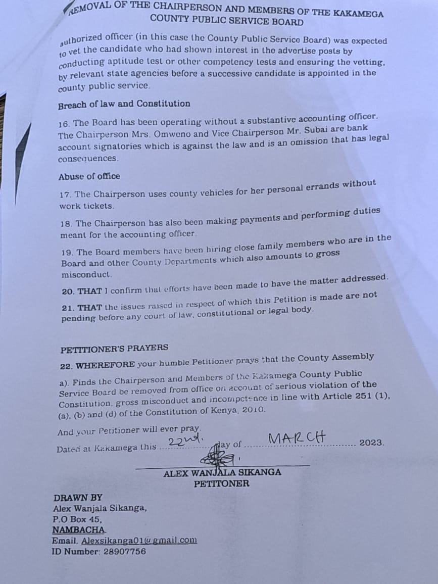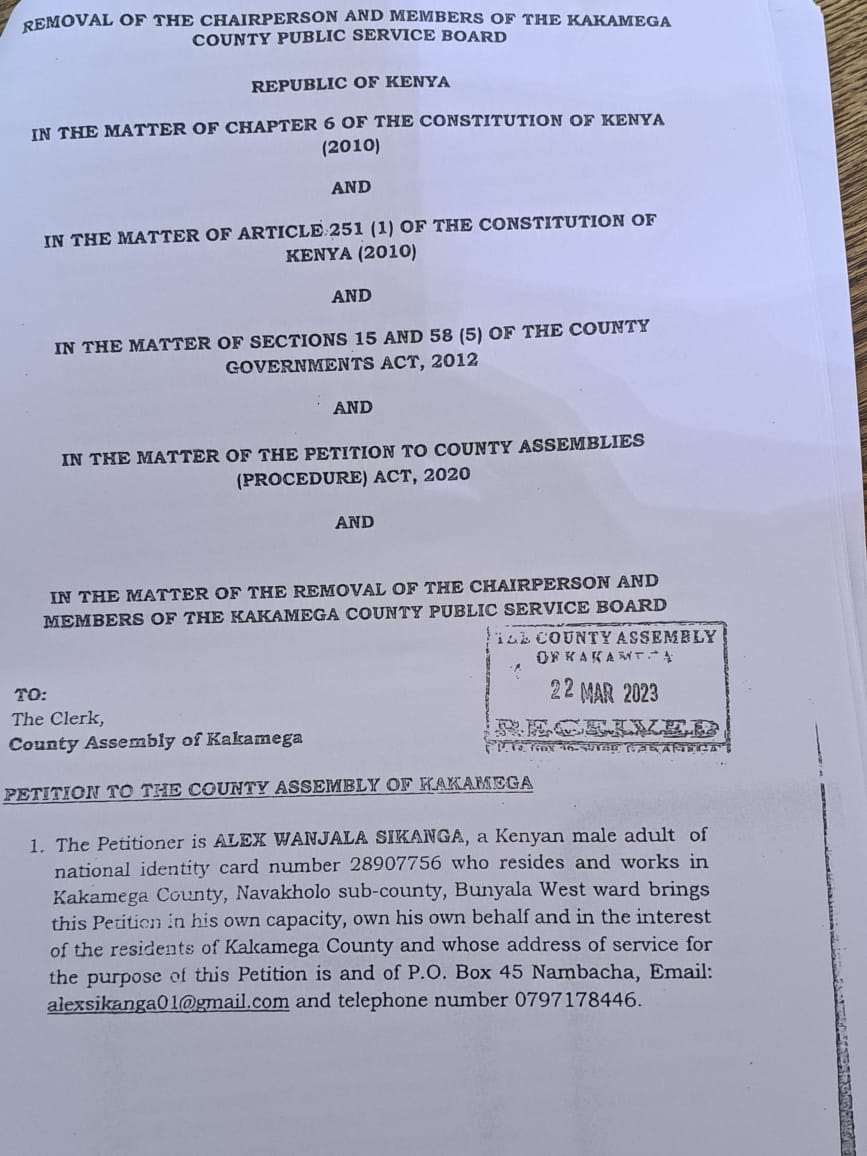 “My petition is about integrity which the service board have fallen short of the constitution and the legal dictates. The only fair thing that can happen is for them to be removed from office and a competent board recruited,” said Mr Shivakale