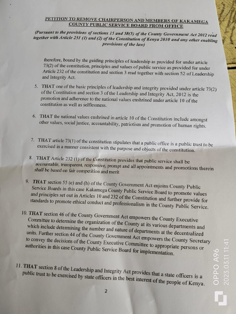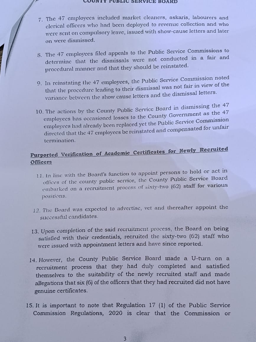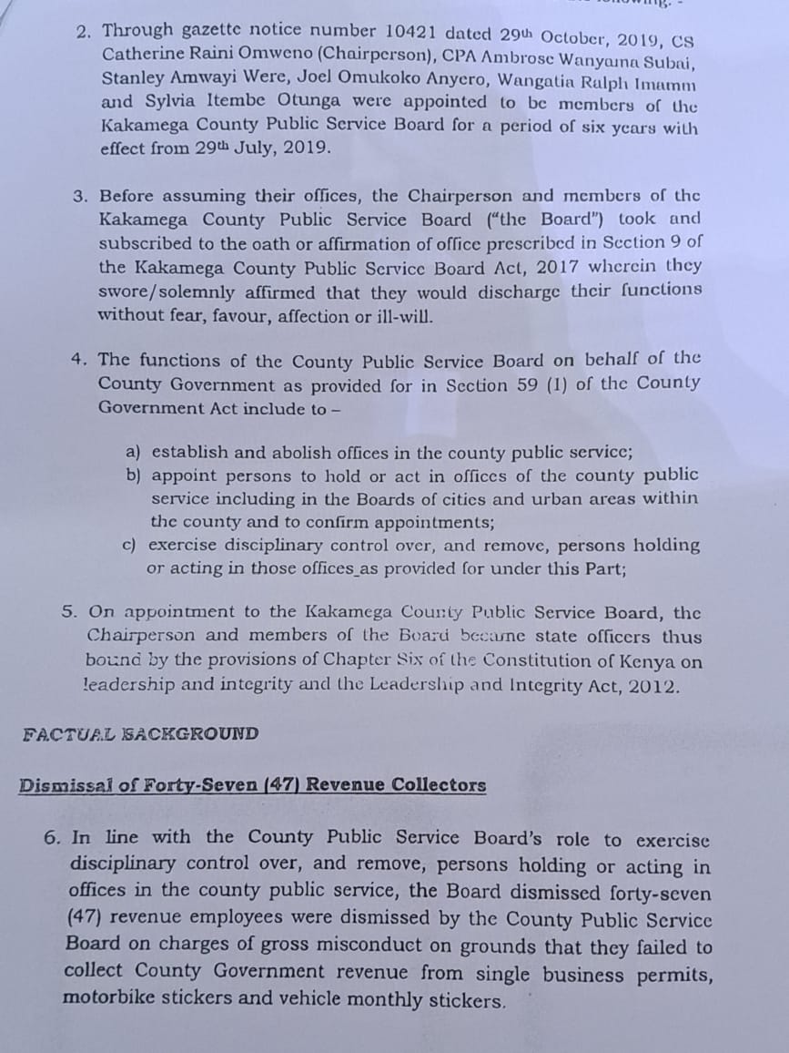 He added : “That the conduct of the service board was jointly or severally negligent, reckless, selfish, illegal and devoid of national values of social justice, accountability and in accordance with Chapter Six of the constitution on leadership and integrity,” said Shivakale