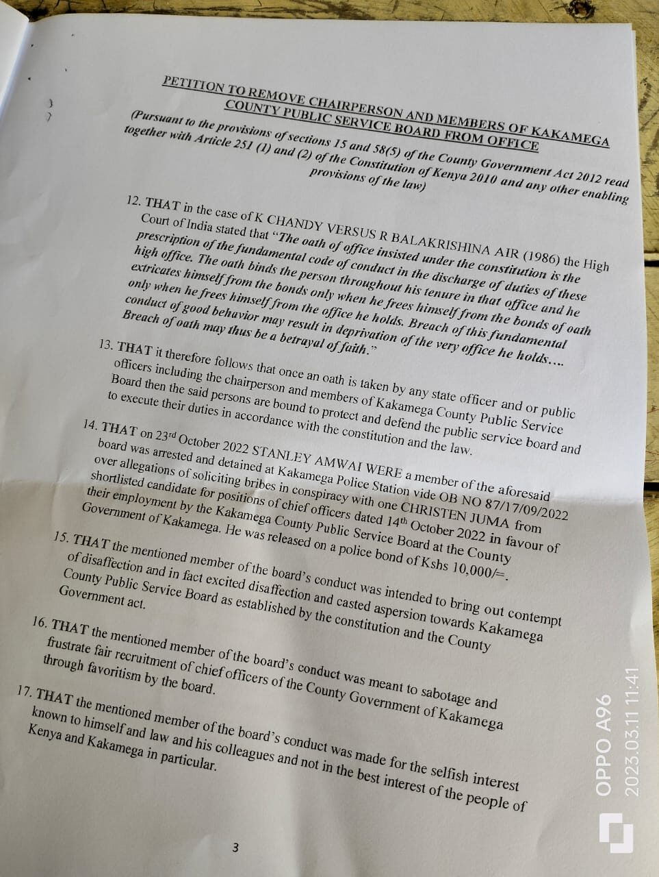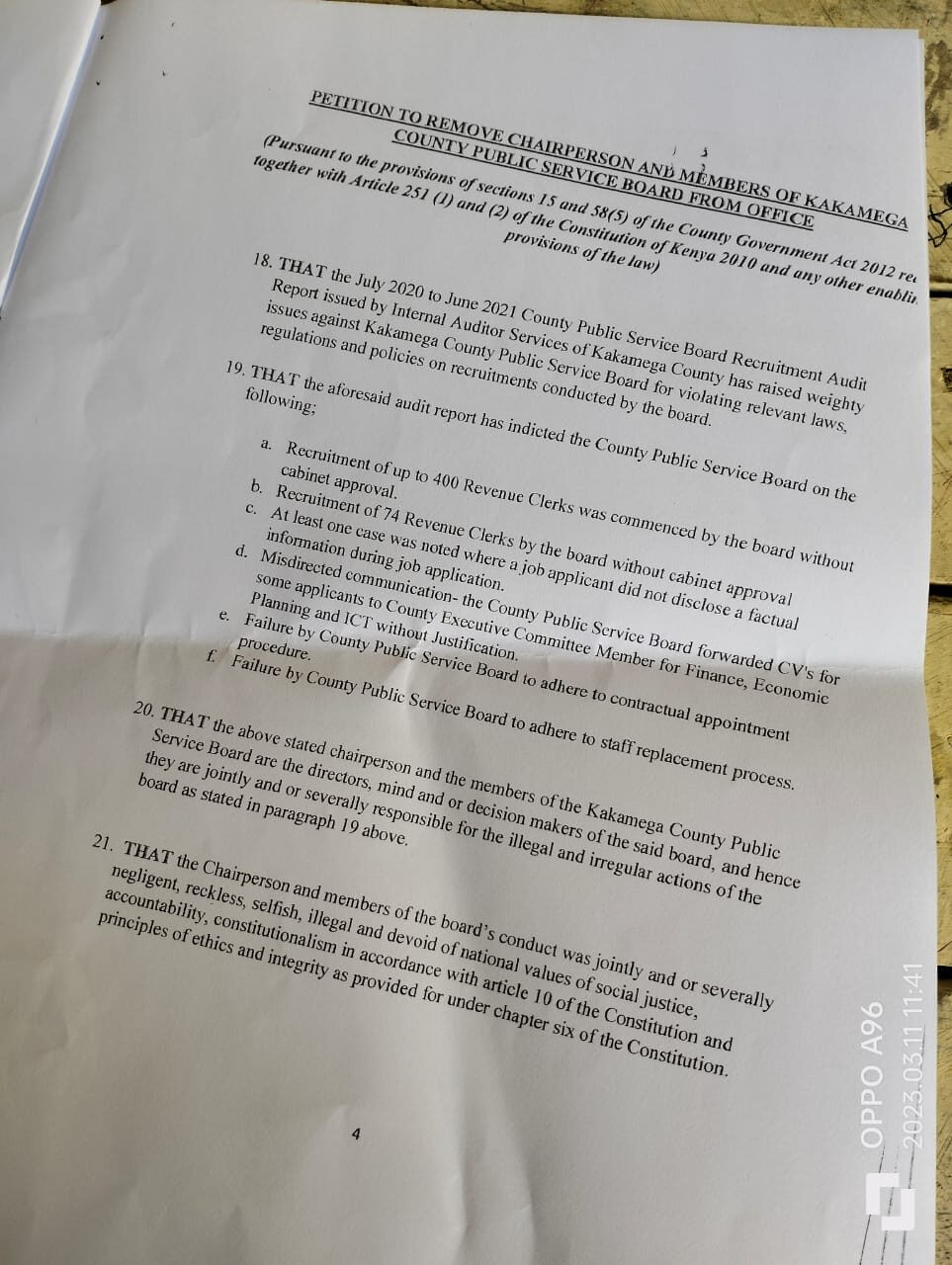 He also demanded that the committee to supply them with a report from the OCS, Kakamega Central Police station over alleged arrest of the board official receiving a bribe and the information supplied to them by the public service board secretary in secret.