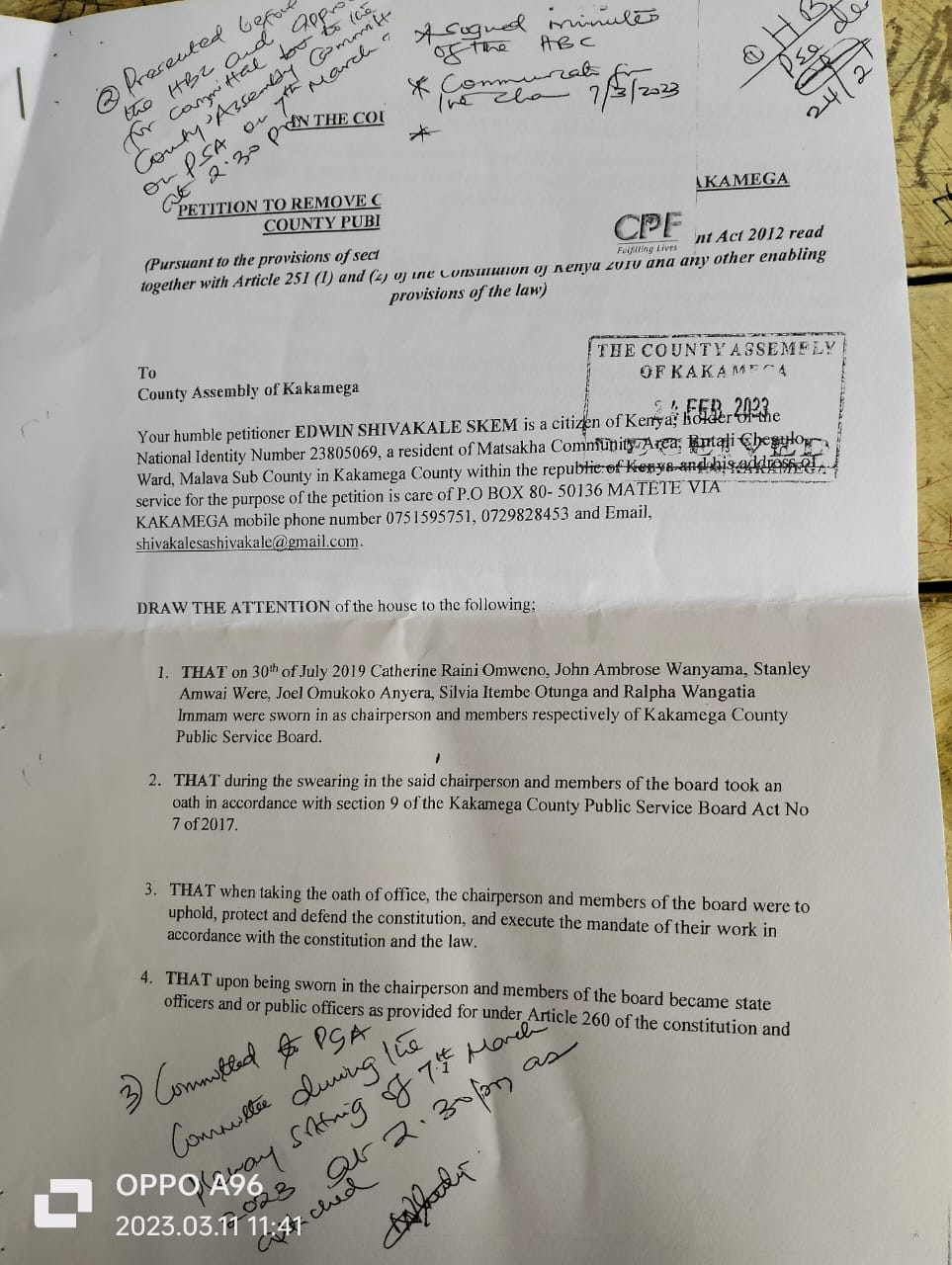 There was drama at the County Assembly of Kakamega during the hearing of two petitions seeking for the removal of members of Kakamega County Public Service Board (CPSB).