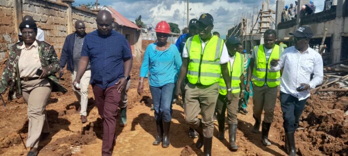 Caption : Sports Principal Secretary Peter Tum (with black cap and reflector jacket) flanked by Eng. Agnes Wachie (in red cap) during an inspection tour of Masinde Muliro stadium – Kanduyi – Photo/Micah Sali.