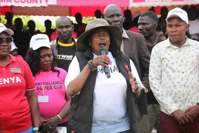 Bungoma Women MP Catherine Wambilianga addressing a mamoth crowd that attended the finals of Wambilianga Super cup at Pan Paper grounds,Webuye town on Sunday.