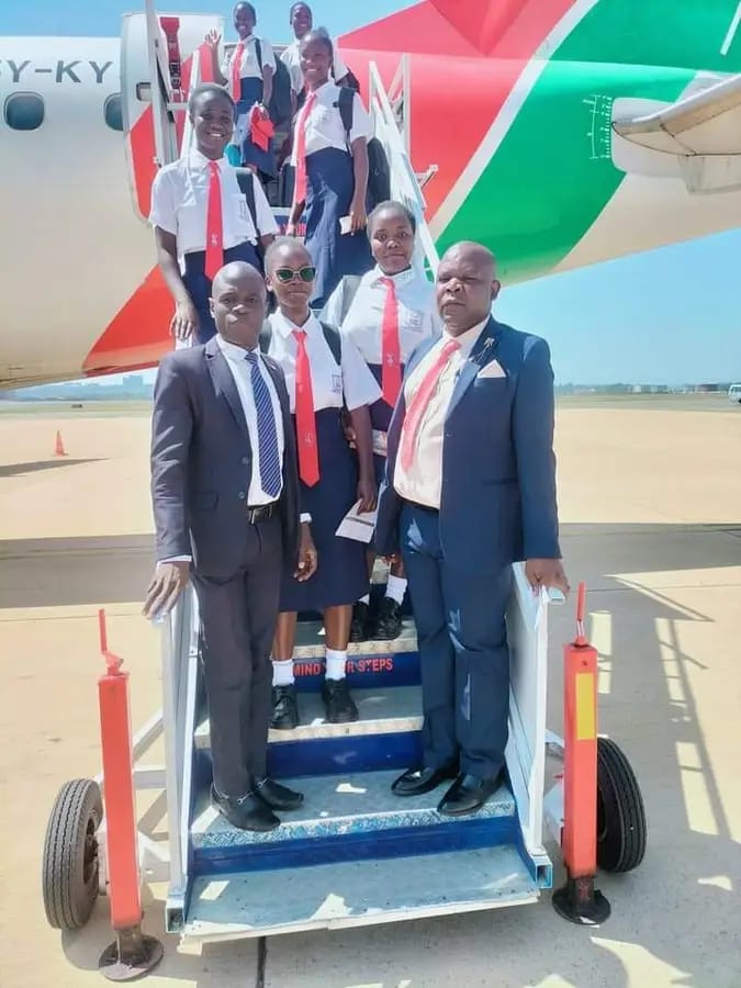 Ng’iya Girls high school A-graders leaving Kisumu International Airport (KIA) enroute to Jomo Kenyatta International Airport (JKIA) for a benchmarking mission with Loreto High School on board KQ655. Quality doesn’t come cheap.