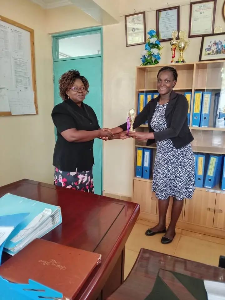 Bushiangala TTI senior Principal Lucy Muhavi receiving trophy awarded during the Western Region Skills competition.